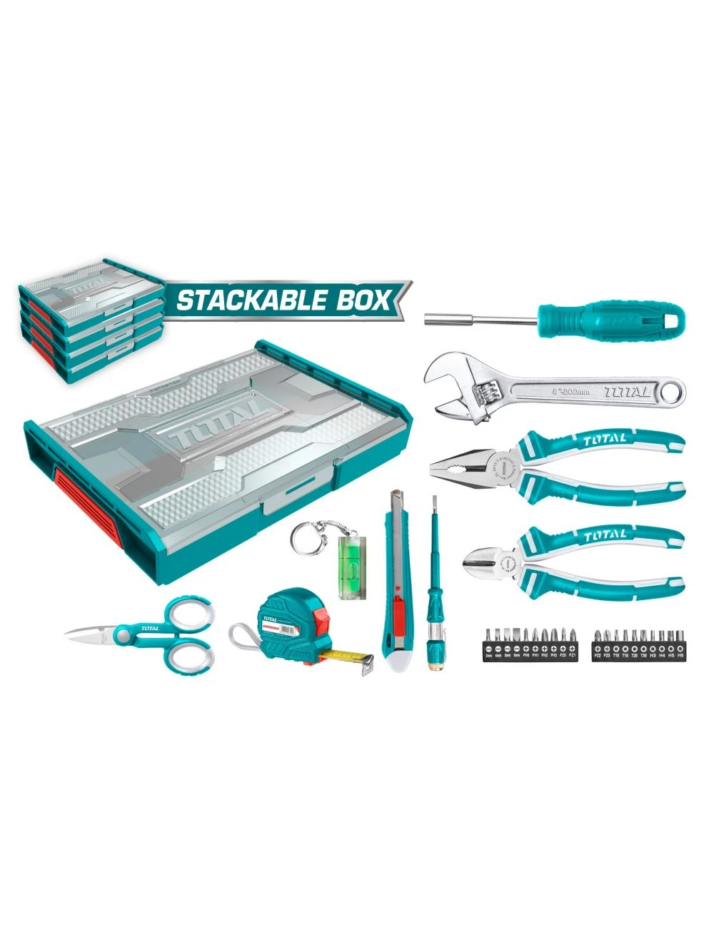 طقم عدة منزلي 29 قطعة من توتال هو مجموعة عملية لتلبية جميع احتياجات الصيانة المنزلية اليومية والأعمال الصغيرة.