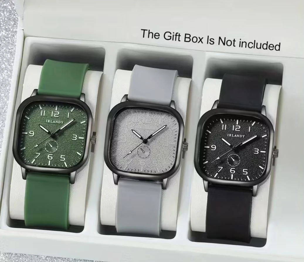 • طقم مكوّن من 3 قطع من ساعات الكوارتز بتصميم مربّع عصري وبسيط يناسب الرجال والنساء.