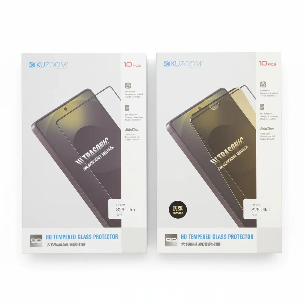 واقي شاشة زجاجي مقوى عالي الجودة مصمم خصيصًا لهاتف سامسونج جالاكسي إس 26 ألترا. تحتوي هذه العبوة المكونة من 10 قطع على تصميم فائق النحافة متوافق مع خاصية فتح القفل ببصمة الإصبع، مع صلابة 9H لتوفير حماية فائقة ضد الخدوش والصدمات.