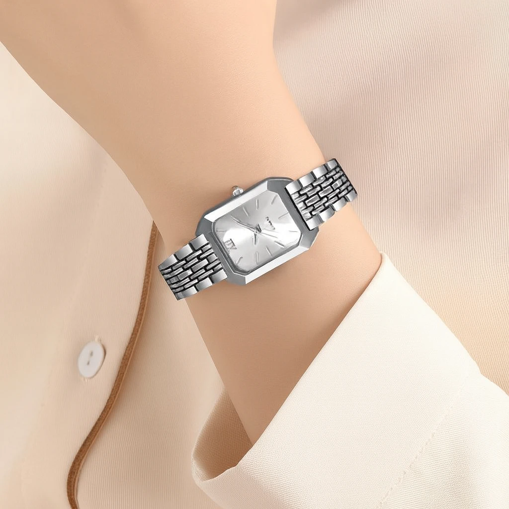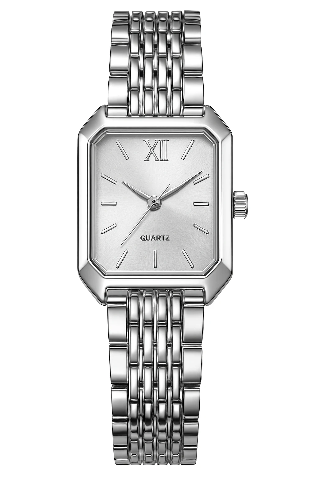 • ساعة يد راقية بتصميم كلاسيكي أنيق، تتميز بواجهة مستطيلة فاخرة باللون الفضي ولمسات رقمية رومانية تضيف لمسة من الفخامة.